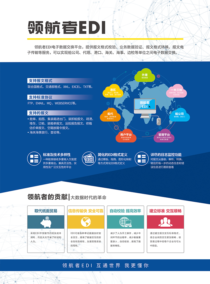 作为企业之间业务数据交互的渠道,EDI在各个行业中有着广泛的使用,尤其是在港航物流领域EDI是不可或缺的。传统EDI交互模式更多的是部署客户端,由客户端完成EDI接收和发送。领航者EDI是以租用方式运营,多种格式报文之间转换工作是有平台完成,减少用户为满足多种不同标准报文而定制开发所需成本支出。领航者EDI可以快速的打通企业跟客户之间信息交互的通道,并为客户提供多种信息交互的方式,如微信公众号、微网站、客户服务平台等,提升企业形象和服务效率。